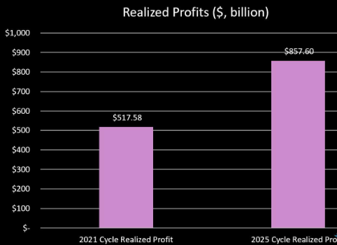 根据 Glassnode 数据,本周期 BTC 投资者已实现 8,570 亿美元利润——较 2021 年周期高出 65%。