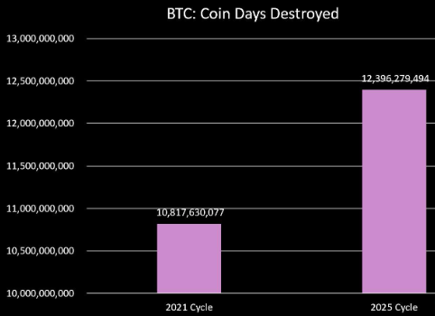 如下图所示,本周期「币天销毁」总量已比 2021 年周期高出 15%。
