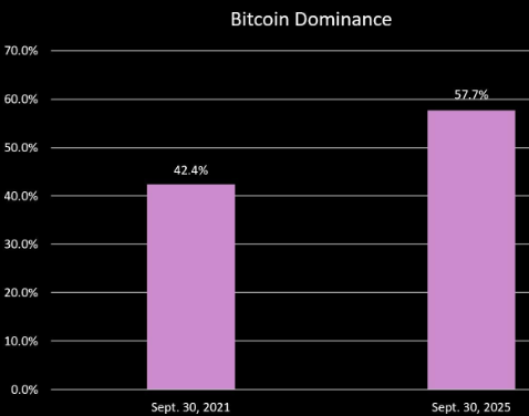 过去两个周期中,市场均在比特币主导地位下降至 40% 左右时见顶。