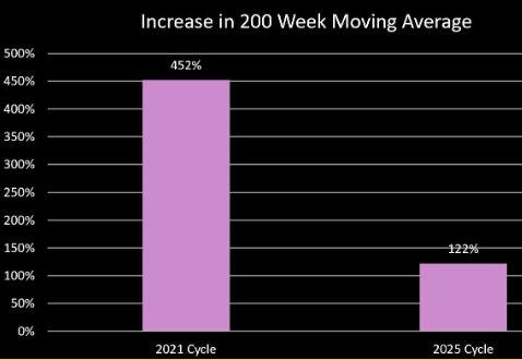 可能性不大,因为我们的估算显示即使未来几个月出现 40% 的大幅上涨,200 周移动平均线也将在 5.7 万美元区间。当然,如果周期延续至明年,回到那些水平是有可能的。
