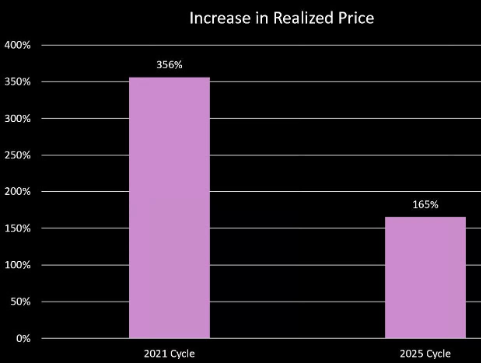 与 200 周移动平均线类似,我们不预计该指标今年能达到前周期高点——这进一步凸显了收益递减规律。