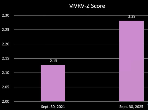 有趣的是,我们现在处于比 2021 年周期同期更高的水平。当时比特币在 10 月 /11 月上涨约 50%,以 MVRV-Z 分数 3.49 结束周期。
